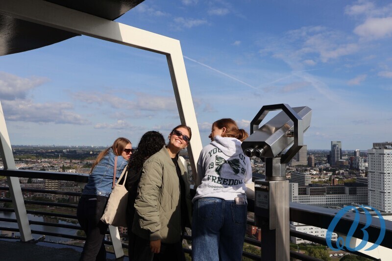 De volgende ochtend begon vroeg. Na een stevig ontbijt gingen we op pad. Naast de gezellige activiteiten stonden er ook culturele uitstapjes op het programma. Een weekend in Rotterdam is immers niet compleet zonder een bezoek aan de Euromast. Voor sommigen was de hoogte een uitdaging, maar die werd met succes overwonnen! Naast het bewonderen van het uitzicht vanaf het platform, was er ook de mogelijkheid om de Euroscoop in te gaan. Begeleid door een boeiende voice-over werden we naar de top van de Euromast gebracht en genoten we van een adembenemend uitzicht over Rotterdam.